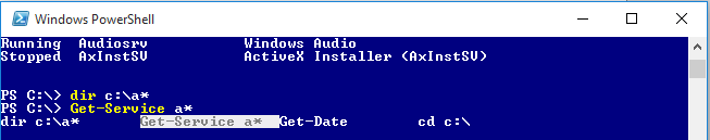 PowerShell 5.0-ban, a konzolban nem működik az F7 billentyűre az „ablakban” felugró történettár, viszont a # jel után a Ctrl+Enter lenyomására, mintha IntelliSense lépne működésbe, megjelennek a korábban bevitt parancsok és választhatunk köztük a nyilak segítségével: