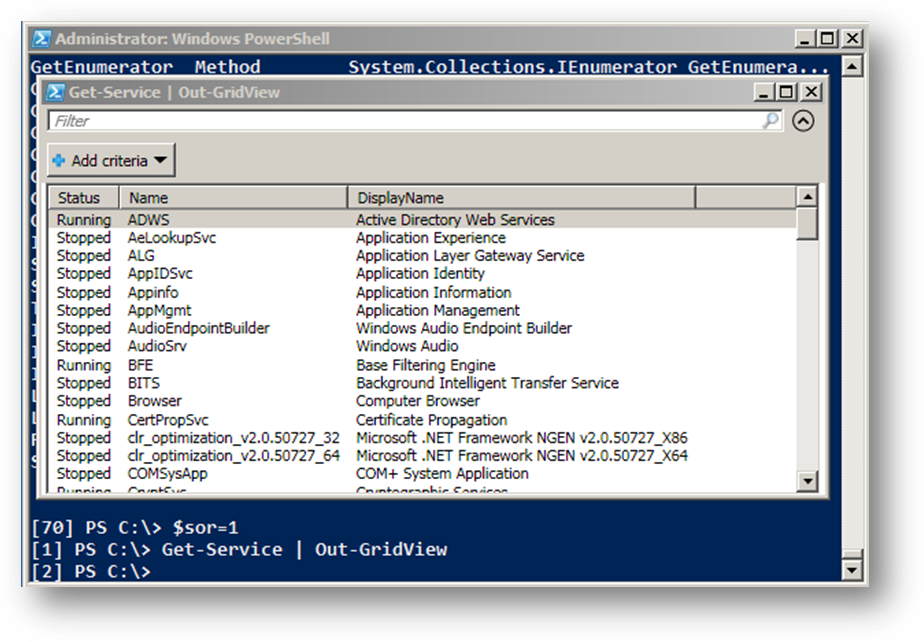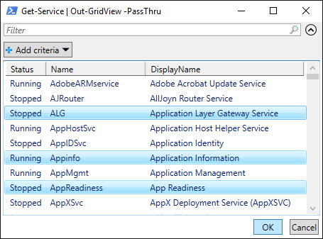 PS C:\> Get-Service | Out-GridView -PassThru