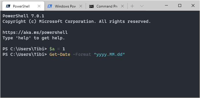 A fenti példában az első fülön a PowerShell 7, a másodikon a Windows PowerShell 5.2, a harmadikon a CMD.exe látható. Minden típusú parancssorhoz más színsémát választhatunk és a beépített parancsértelmező a különböző szintaktikai elemeket más és más színnel jelöli.