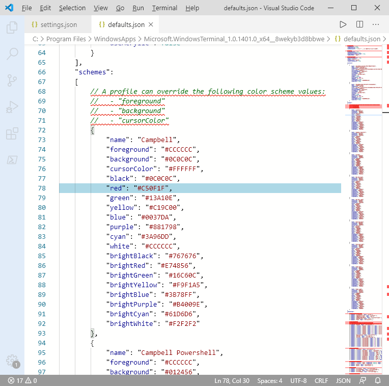 A colorScheme értékével szabályozható a színséma, az előre meghatározott színsémák a defaults.json fájlból olvashatók ki, amit az Alt+Settings-el tudunk megnyitni: