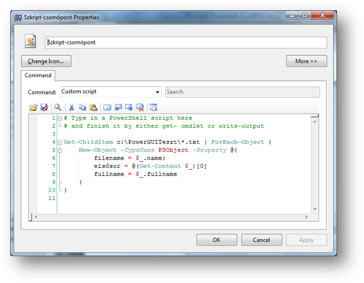 Igazából nincs nagy különbség a három típus között, bármikor átalakítható egyik a másikba. A mappa csomópontok szerep igazából a további csomóponttípusok összefogása, csoportosítása. A „sima” csomópont egy meglevő cmdletet futtat, akár paraméterezhető módon. Ezt viszonylag ritkán használjuk. Az igazi lehetőségeket a szkript-csomópont rejti. Egy ilyen csomópont mögött olyan szkriptet lehet tárolni, aminek valamilyen kimenete van:
