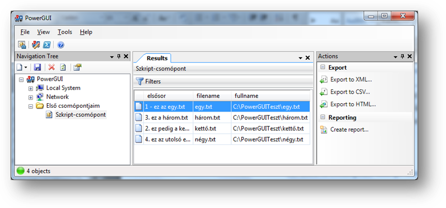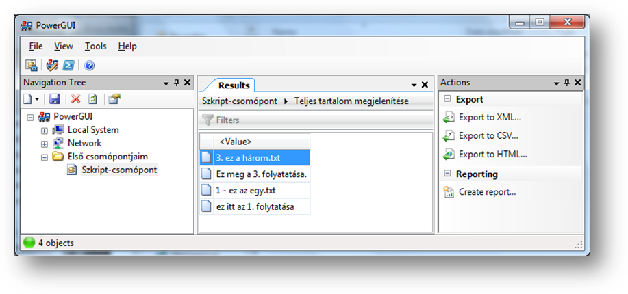 A fenti példámban a szkriptem egy egyszerű kis szövegfájl-listázó műveletet hajt végre, méghozzá olyan módon, hogy a kimeneten a fájlnév és a teljes elérési út mellett a fájl tartalmának első sora is látható legyen. Ha ezt az ablakot az OK-val lezárom, vagy később bármikor erre a csomópontra kattintok, akkor a fenti szkript lefut és az eredmény az PowerGUI ablak középső részén jelenik meg: