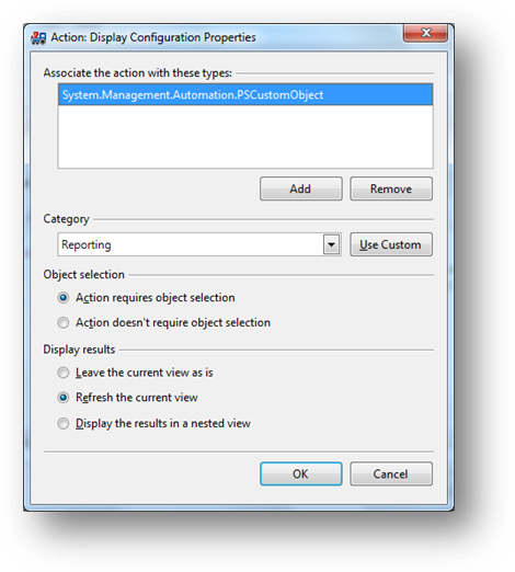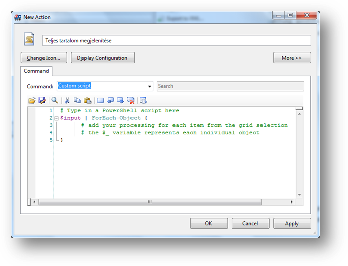 Látható, hogy egy kis keretprogramot, sablont ad rögtön nekünk a PowerGUI, ebben láthatjuk, hogy a középső ablakrészben kiválasztott objektumok lesznek majd benne az $input változóban, és ezeken hajtódik végre rendre egy ForEach-Object ciklussal az, amit mi megírunk. Azonban vigyázzunk! A tevékenységek nem csomóponthoz-kötöttek, hanem objektumtípushoz! Azaz elég egyszer definiálni egy tevékenységet, az innentől kezdve automatikusan megjelenik minden olyan esetben, amikor bármelyik csomópontra is kattintunk, de a rácsban az adott objektumtípus jelenik meg. Ezt az típus-hozzárendelést a Display Configuration gomb megnyomásával láthatjuk, illetve állíthatjuk be: