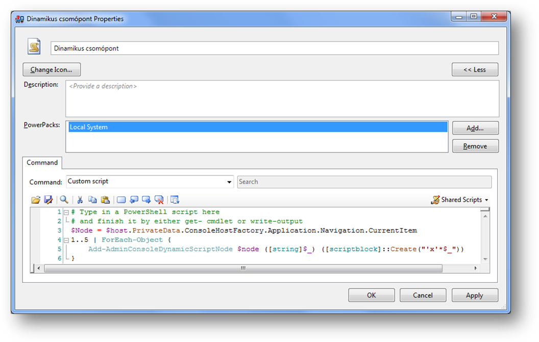 Ezen „csomópontgyár” szkriptjében használom a PowerGUI Local System csomagjában (PowerPack, lásd később) definiált Add-AdminConsoleDynamicNode megosztott függvényt, amivel az ilyen dinamikus csomópontokat le lehet generáltatni. Ahhoz, hogy ez a függvény látható legyen az én szkriptem számára, a More gomb megnyomása után feltáruló középső ablakrészben a PowerPack-ok közé fel kellett vennem a Local System csomagot is.