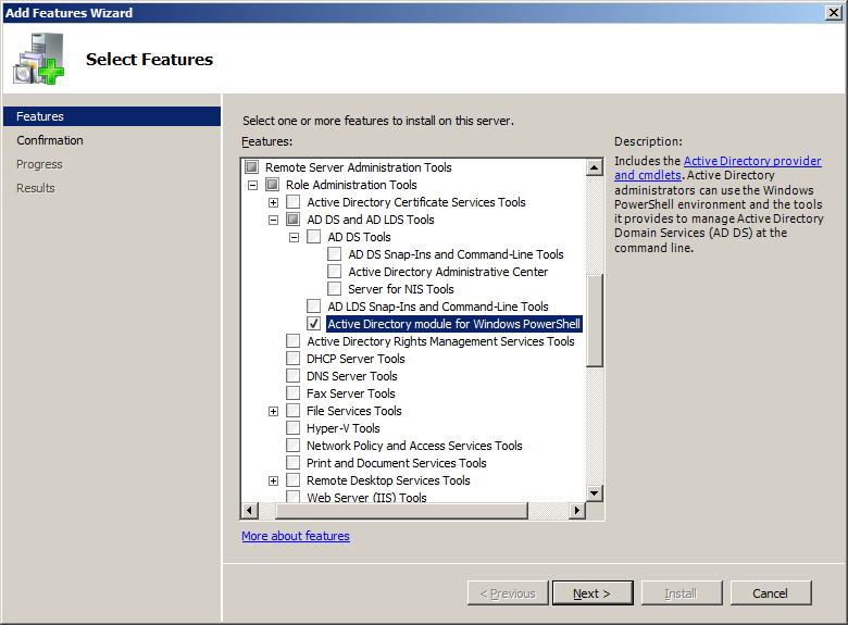 Ahhoz, hogy az Active Directory-val kapcsolatos cmdletek és az AD provider elérhető legyen, elsőként importálni kell az ActiveDirectory modult. Ezt akkor tehetjük meg, ha a Windows Server 2008 R2 rendszergazda eszközei között található Active Directory module for Windows PowerShell képességet telepítjük.