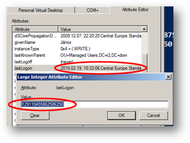 Sajnos nem mindig ilyen egyszerű a helyzetünk, hiszen néhány dátumot jelző attribútum nem ilyen formátumban tárolja az időt, hanem un. „tick”-ekben, ketyegésekben. Ez 1601. január 1. 0:00 időponttól eltelt 100 nanoszekundumokat jelenti, mindez long-integer formátumban. Ilyen attribútum például a lastLogon, lastLogonTimestamp, lastLogoff, pwdLastSet. Ha ilyen attribútumok valamely értékére akarunk rákeresni, akkor elő kell tudnunk állítani ezt az értéket. Szerencsére a .NET keretrendszer ebben is segít. Elsőként nézzük, hogy dátumból hogyan tudunk ilyen long-integer-t előállítani: