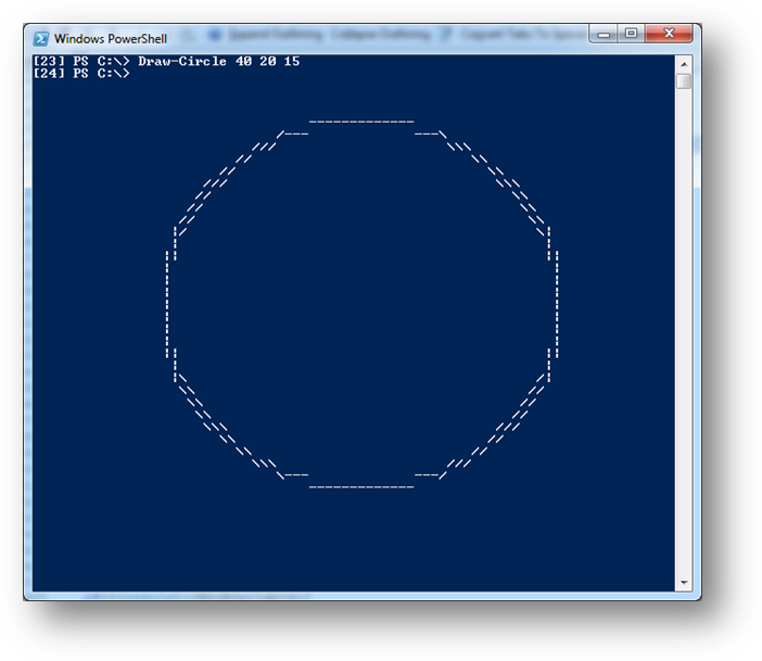 A függvény definíciója nem sok magyarázatot igényel. Az $x, $y a kör közepének koordinátái, az $r a sugara, a $step a kör kirajzolásának a „felbontása” fokokban, melyet a sugár nagyságához igazítok. Kis körnél a két egymás melletti körívpont kirajzolásához nagyobbat lehet fordulni, nagyobb körnél kisebbet lehet csak fordulni, különben „lukacsos” lesz a körív. A karakterek nem négyzet alakúak, a WMI video vezérlő adataiból meg lehet a monitor vízszintes és függőleges felbontását határozni, valamint ezt összevetve a karakterszámban kifejezett maximális PowerShell ablakmérettel, ebből kijön a konzol fontjainak téglalap formájának aránya, amit a $deform változóban tárolok. Plusz még a fok függvényében más és más karaktert rak ki a képernyőre, amelyek jobban szimulálják a körívet.