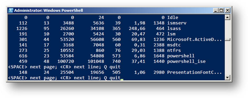 Még egy cmdlet kívánkozik ide, az Out-Host . Ez a cmdlet a kimenetét kiírja a konzolra. Tulajdonképpen elhagyható, hiszen a kimenet alaphelyzetben is a konzolon jelenik meg, de ennek a cmdletnek van egy ‑paging kapcsoló paramétere. Ennek alkalmazásával lapozni tudjuk a kimenetet, ami főleg sok adat megjelenítésekor lehet praktikus:
