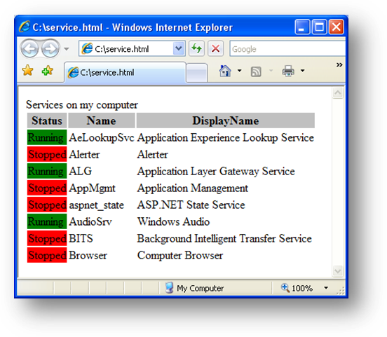 [7] PS C:\> Get-Service [a-b]* | ConvertTo-Html -Property Status,Name,DisplayName -head "Services on my computer" > service.html