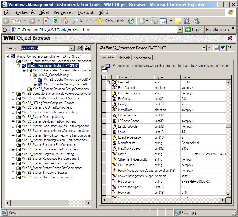 Példányok (Instances) – Míg a Win32_NetworkAdapter osztály bármilyen hálózati adapter leírására képes, az osztály példánya egy bizonyos, fizikailag is létező adapter reprezentációja. Az egyes példányokat az adott osztály kulcs tulajdonságának ismeretében szólíthatjuk meg. Az objektum példányokat a WMI Object Browser segítségével jeleníthetjük meg (az eszköz a WMI Tools csomag része).