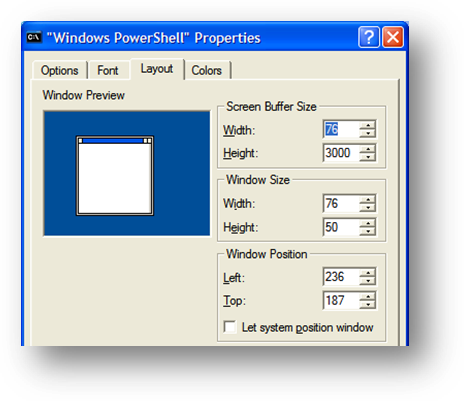 A „Layout” fülön lehet optimálisabb ablakméretet beállítani. Ez főleg az ablak szélessége szempontjából fontos, mert majd látni fogjuk, hogy a PowerShell parancsok kimenete nagyon gyakran táblázat jellegű, és annak jobb, ha minél szélesebb ablakban tudjuk megjeleníteni.