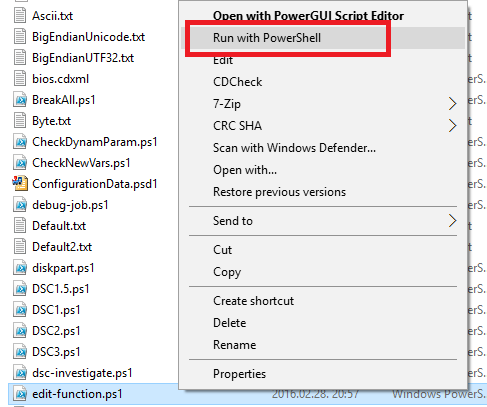 A korábbi szokásokkal (cmd, vbs, stb.) ellentétben (természetesen szintén biztonsági okokból) maga a szkriptfájl közvetlenül nem indítható el a shellen kívül, mivel a ps1 kiterjesztésű fájlokat alapértelmezés szerint a notepad.exe nyitja meg. PowerShell 3.0 után megjelent egy új lehetőség szkriptek futtatására. Ha a Windows fájlböngésző ablakában egy szkriptfájlra jobb egérgombbal kattintunk, akkor megjelenik egy új menüpont: „Run with PowerShell”: