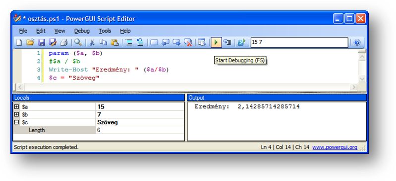 Az eszközsorban látható „Start Debugging (F5)” gombbal lehet futtatni ott helyben a szkriptet. Az eszközsorban, a beviteli mezőben lehet paramétereket is átadni (a képen ez most „15 7”). A futás során generálódó output kikerül a jobb alsó ablakrészbe és a belső változók tartalma is azonnal megtekinthető a baloldali részben. A jobb szemléltethetőség kedvéért még egy felesleges $c változót is felvettem, hogy látható legyen az, ahogyan a „Locals” részben a változókban tárolt objektumok tulajdonságai is azonnal elérhetők és kiolvashatók, nem kell állandóan get-member-t futtatni.